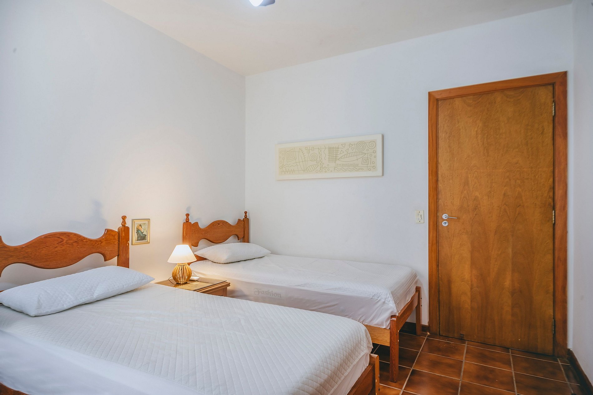 Quarto 2: 2 camas de solteiro, armário embutido, ar condicionado e ventilador de teto.