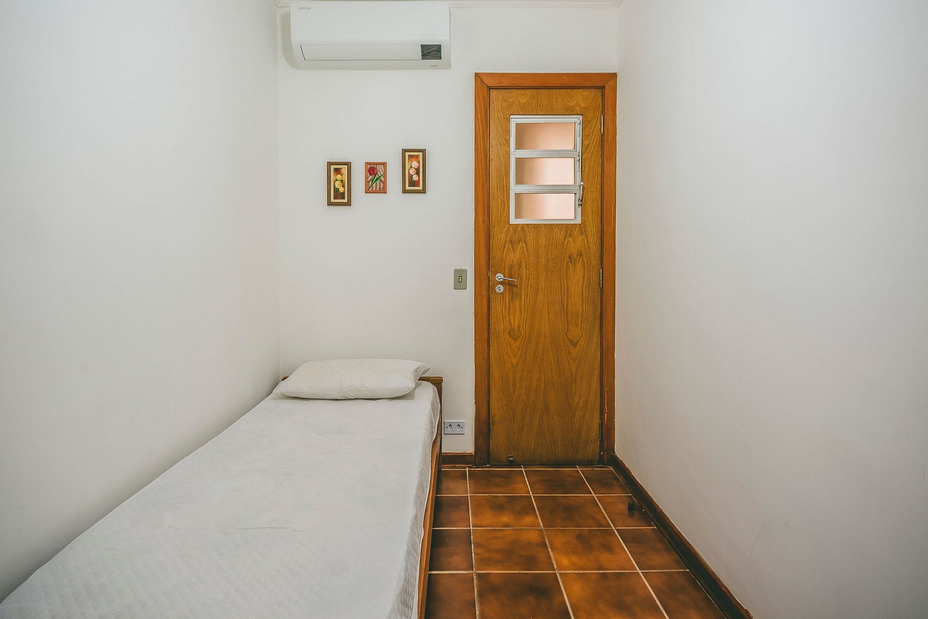 Quarto 4: Pequeno quarto com uma cama de solteiro e ar condicionado.