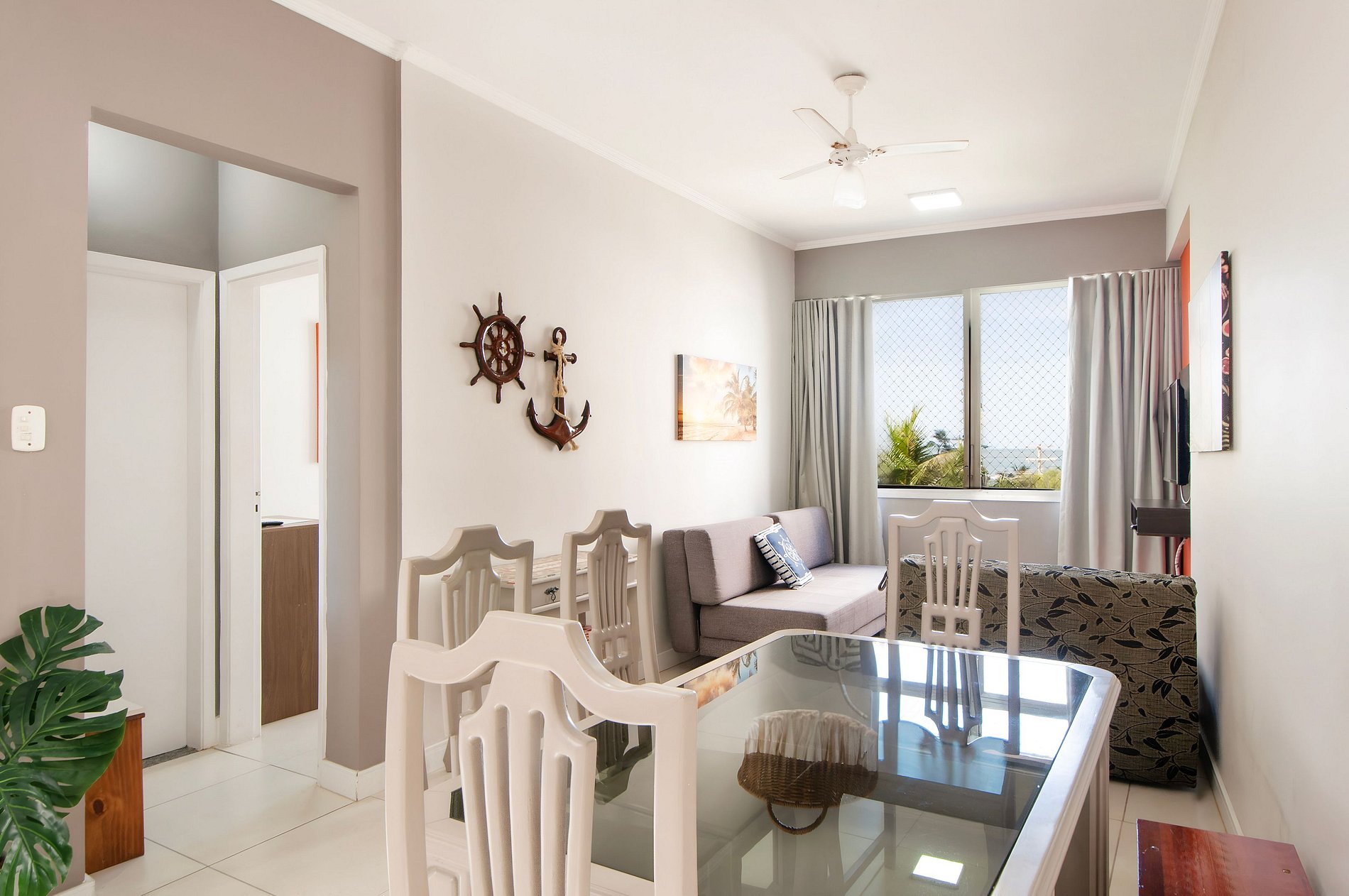 Na sala oferecemos um 2 sofás cama de casal, TV SMART (Você pode fazer o login do seu Netflix, Amazon e etc...) e ventilador de teto.