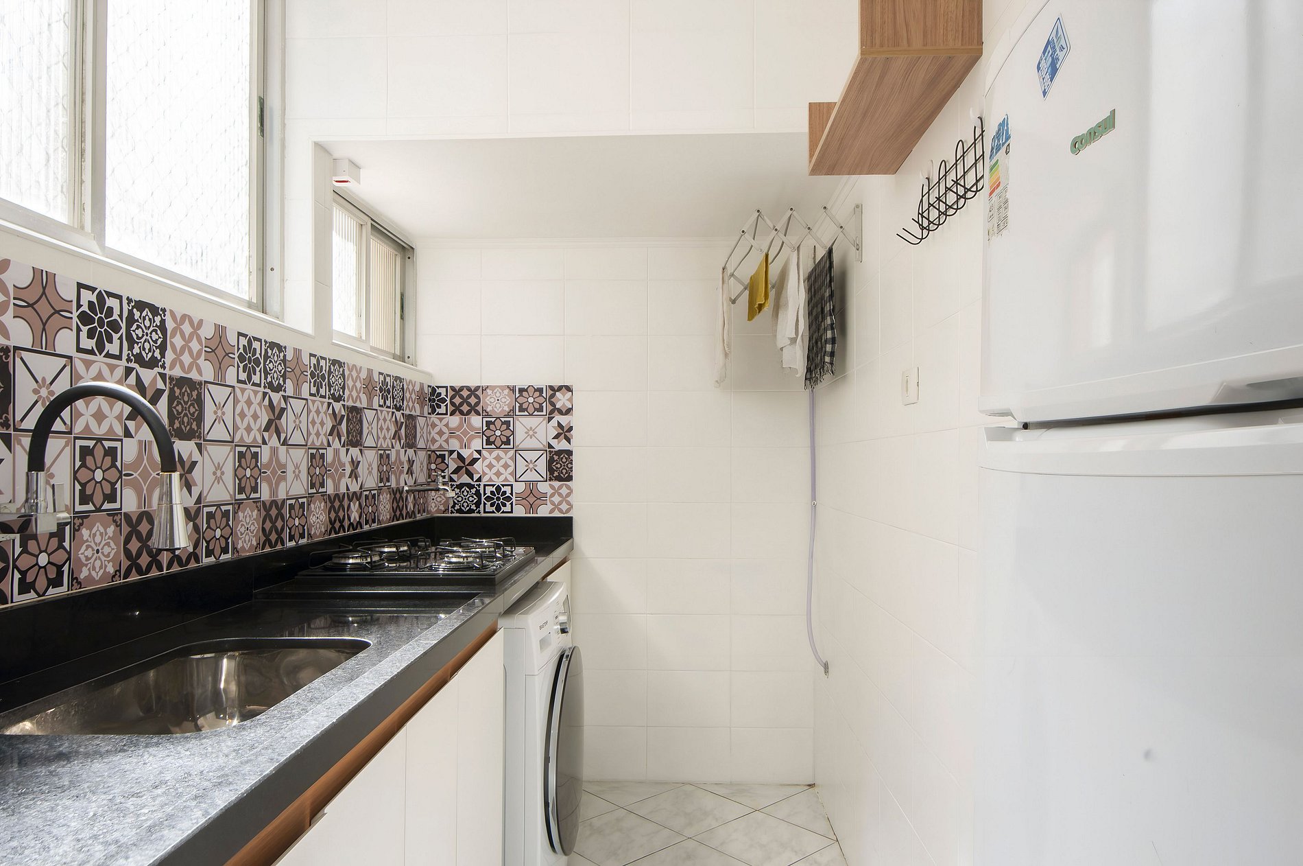 Máquina de lava, tanque e varal.